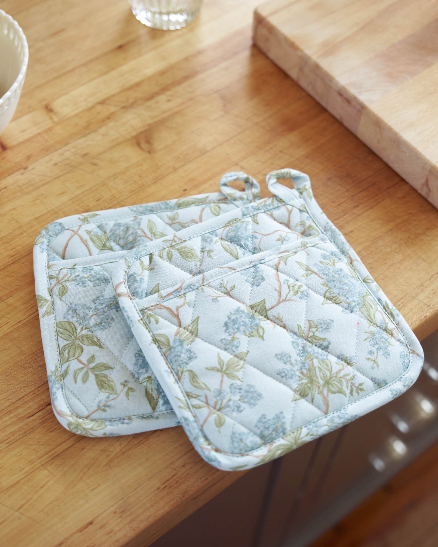 Enhance your kitchen with Hyacinth Pot Holder Set, featuring our hand-drawn floral print in chic blue that brings charm to your cooking space. These pot holders are crafted with a heat-resistant lining to protect your hands and surfaces from hot cookware. The diamond quilting and sweet print make them a beautiful addition to your kitchen.