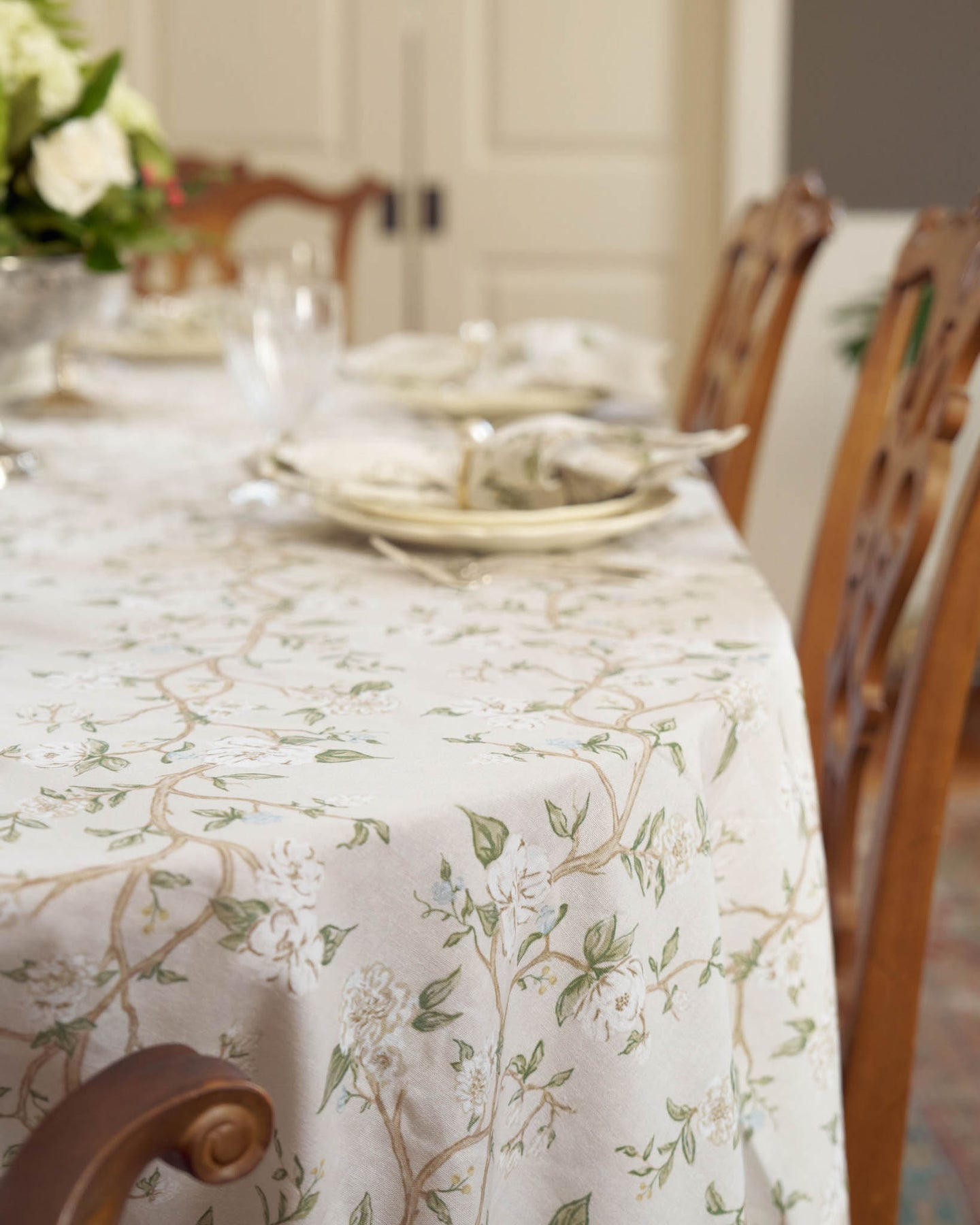 Set an elegant spring and Easter table with our Camellia Tablecloth, inspired by the camellia blooms found throughout Charleston. Crafted from premium cotton, it features a soft, natural drape and a neutral floral palette that complements any setting. Designed for both everyday dining and special gatherings, it layers beautifully across seasons. Complete the look with our coordinating linens for a timeless, effortless table.