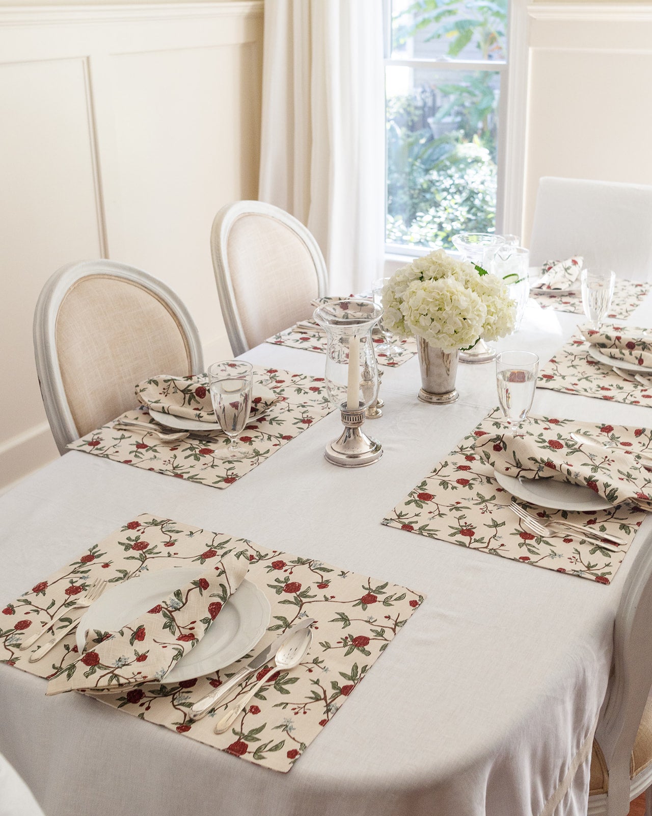 Perfect for both everyday meals and Spring gatherings, our red floral placemats protect your table while adding character to the setting. Featuring our hand-drawn red floral print, this set of four is crafted from a durable slub-textured premium cotton. Designed to layer beautifully, these placemats pair effortlessly with coordinating table runners and napkins to create an elevated, collected tablescape for spring.