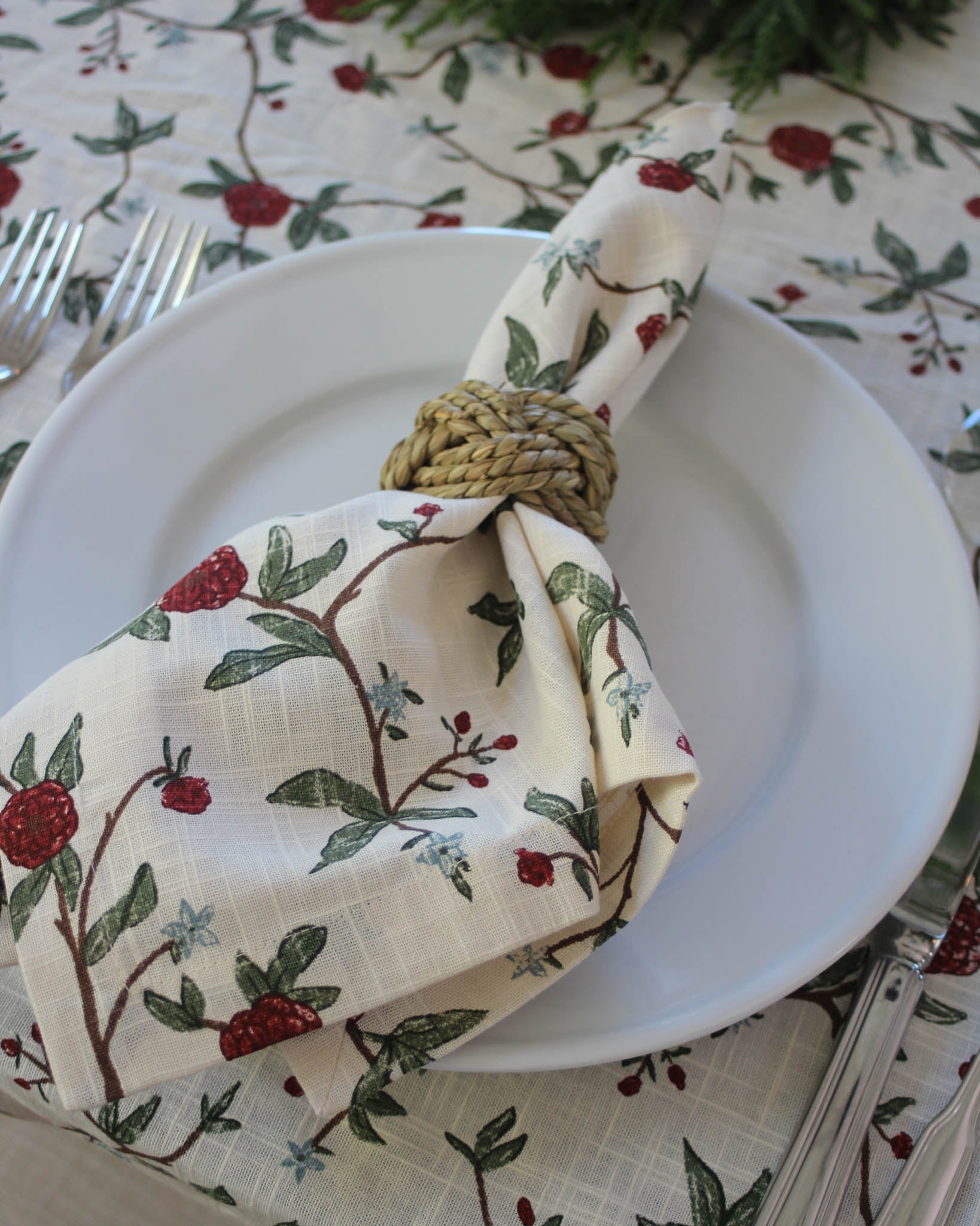 Ideal for both special occasions and Christmas dining, our red floral napkins bring a charming pop of color to your table. This set of four napkins, in our hand-drawn red- green floral print, is crafted from a soft and durable slub textured, organic cotton fabric.  Pair with our coordinating linens for a timeless table setting.