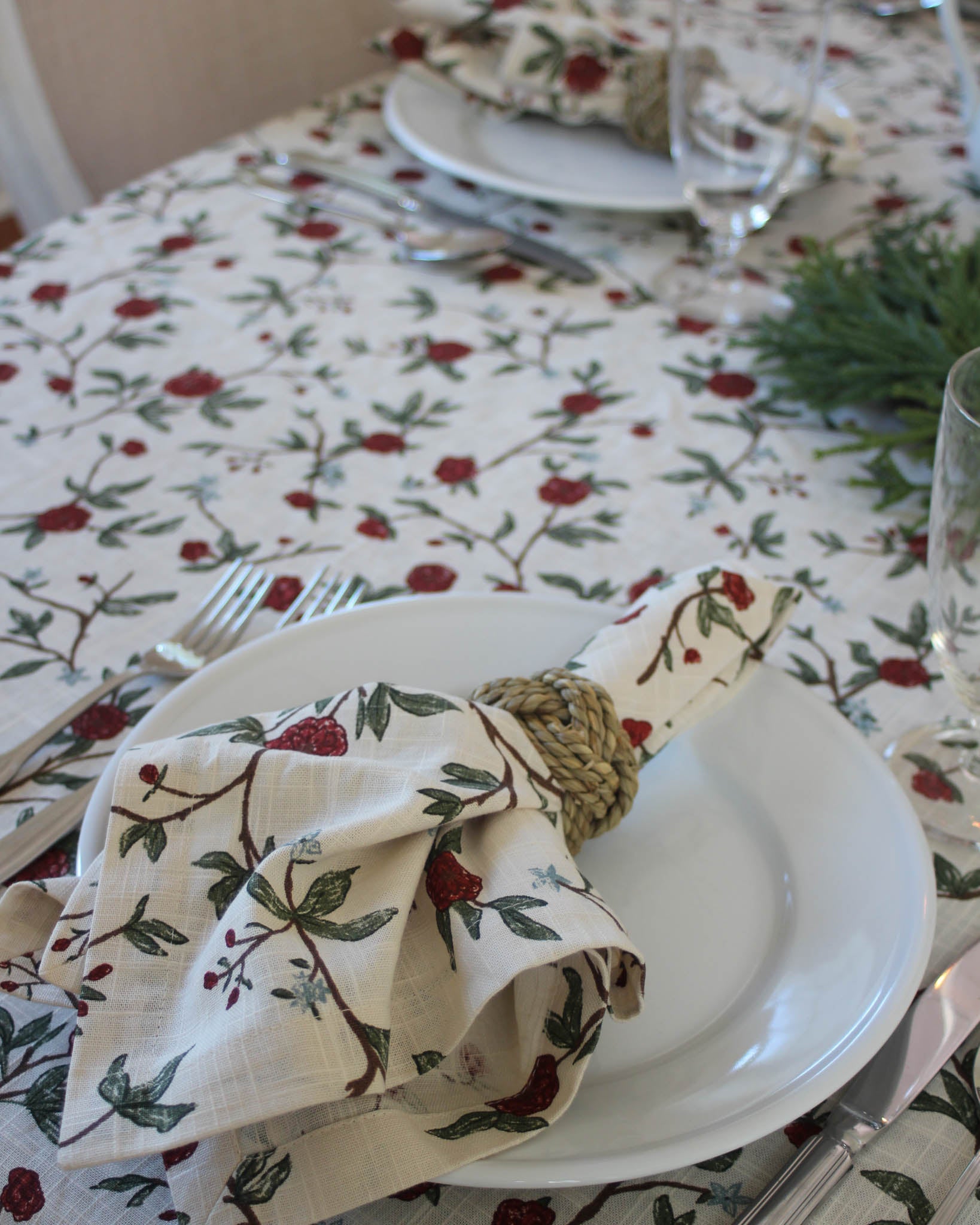 Transform your Christmas table decor and protect your table with the red floral tablecloth in hand drawn design. Made from a slub textured organic cotton, it has the perfect balance of softness and durability, perfect for memorable holiday gatherings. Pair with our coordinating table linens for an effortless Christmas tablescape.